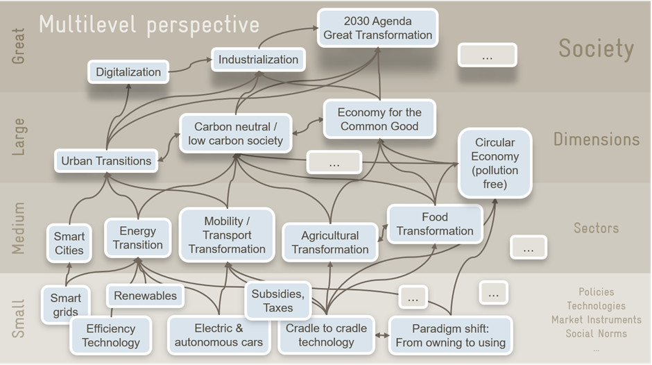 Two, we need to strive for scaling up disruptive innovation to a new mainstream on a defined system level (scaleAbility). On a vertical scale, our interventions may be located and further scaled from local to global levels, and on a horizontal scale comprise single technologies, norms, etc. (small transformation); entire sectors, like energy or agriculture (medium transformation); up to whole societies, like carbon neutral and digitalized societies (large/great transformations). No matter at which system level we locate a transformation (transformative ambition), we need to create a new mainstream - otherwise it would not be a transformation of a system. Single projects and usual timeframes will not suffice to support transformation, even on 'smaller' levels. Interventions should systematically find and support champions and resources who are able to catalyse tipping points towards a new system.