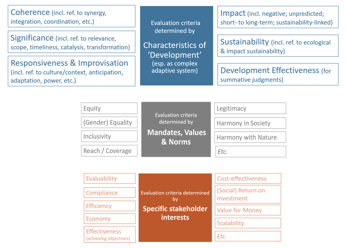 Second, as I said earlier, in evaluation convention stakeholders are free to determine whatever evaluation questions and criteria they believe will be useful during a particular snapshot in time. Either our evaluation questions, or our evaluation criteria, have to force us to focus every single time on crucial aspects that have to be assessed if we are serious about evaluating for development.